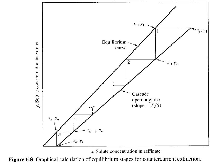 guardando la figura allegata: Xf e Y1 le conosci perchč sono la concentrazione d'alimentazione e Y1 č la concentrazione dell'estratto finale che puoi misurare o che vuoi ottenere. sulla base di questi dati, puoi calcolare il numero di stadi con questo semplice metodo grafico. il numero degli stadi in pratica č dato dal numero di vertici che si trovano sulla retta d'equilibrio (quella passante per l'origine).